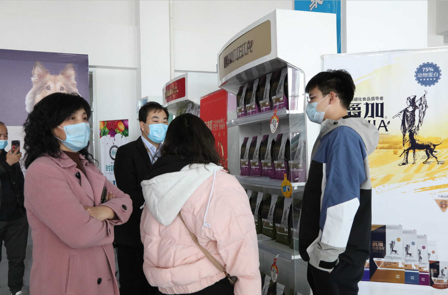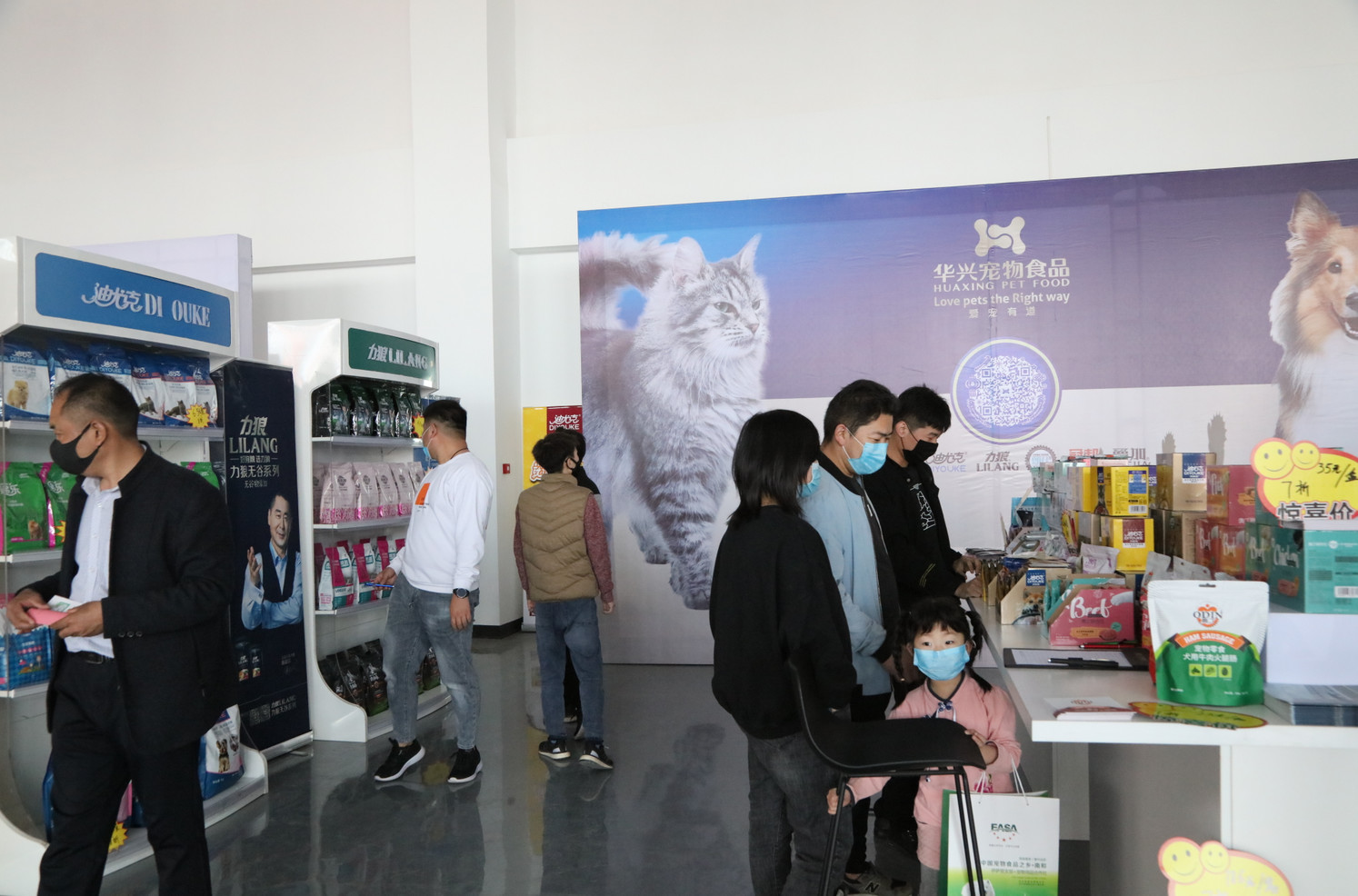 會展中心正門口便是華興寵物食品的展位,剛開展就已經有顧客開始參觀咨詢。 雖然我們這里屬于相對比較安全的城市,但是為了防控疫情,參展人員和工作人員仍必須全程佩戴口罩。