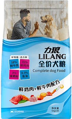 原料組成:鮮雞肉(35%)、鮮牛肉(16%)、蛋黃粉(3%)、魚油(0.3%)、大豆分離蛋白、玉米淀粉、甜菜粕、寵物飼料復合調味料。